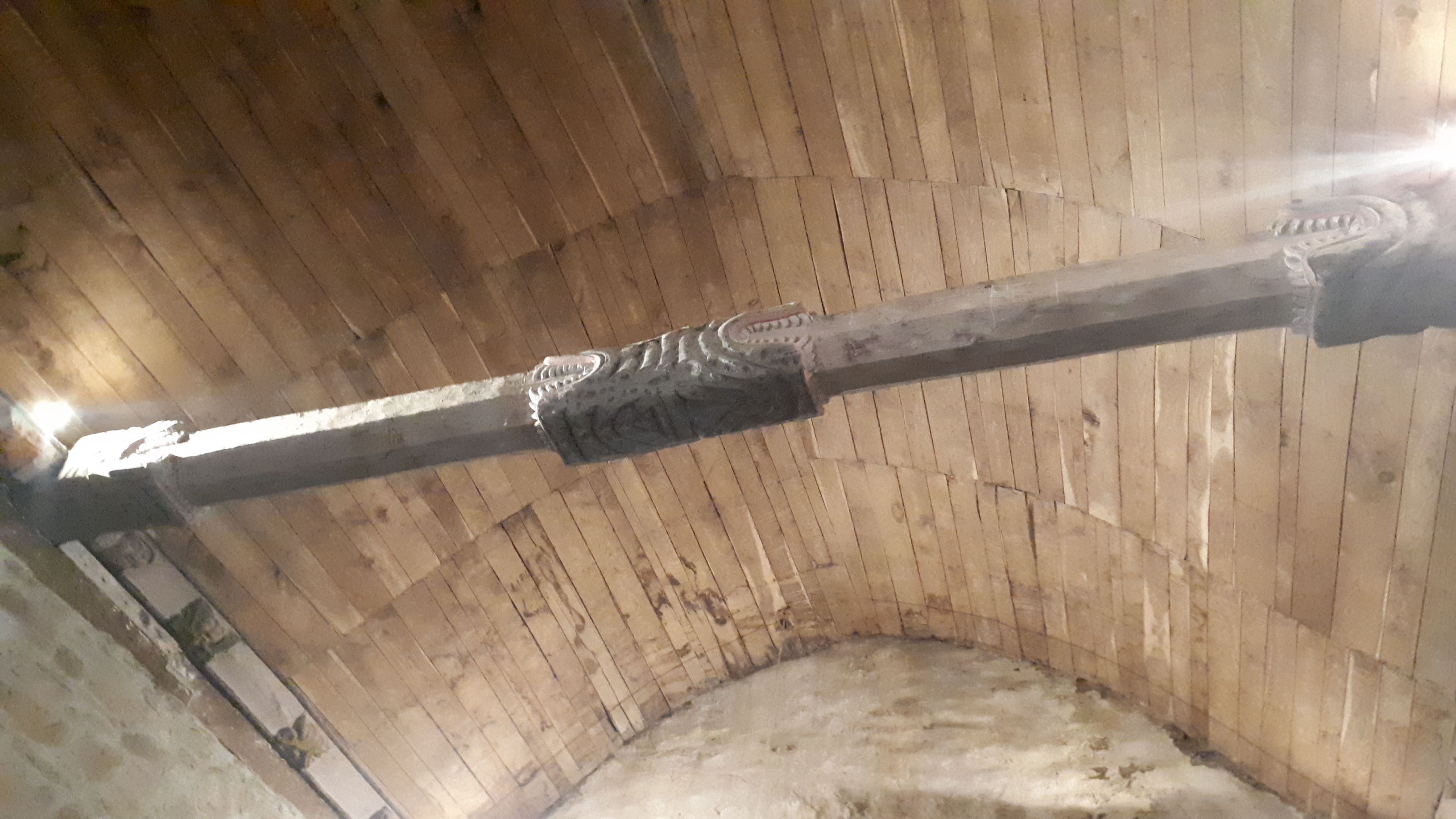 Très curieuse chapelle avec poutres intérieures en bois sculptées d'animaux