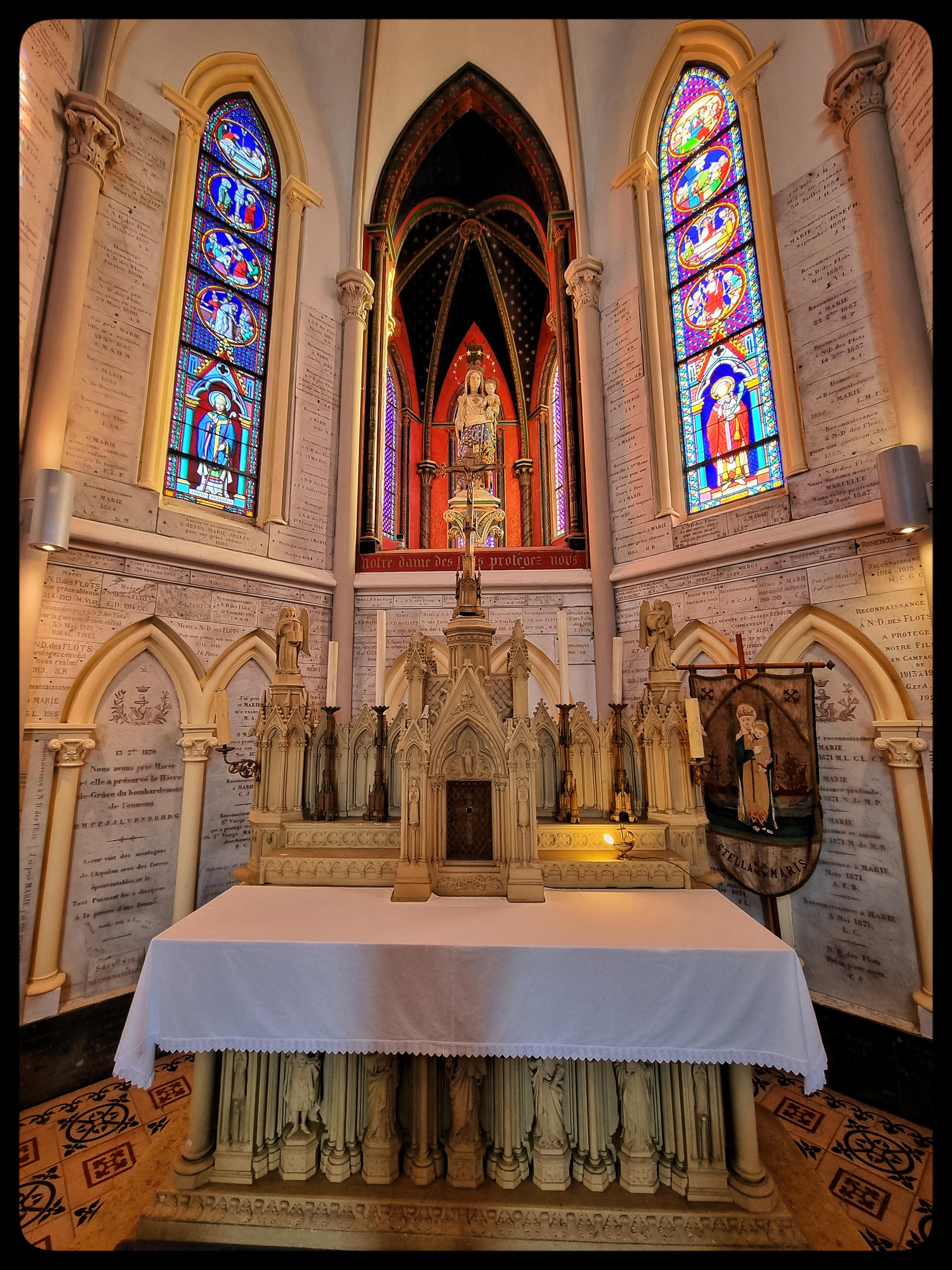 Magnifique chapelle édifiée vers le milieu du XIXeme siècle cette église à été épargnée des bombardements de la seconde guerre mondiale, elle reste un témoin de ce que les hommes du siècle cité au dessus pouvée construire à l interieur hummm très jolie architecture un style néo gothique d'une pure beauté.