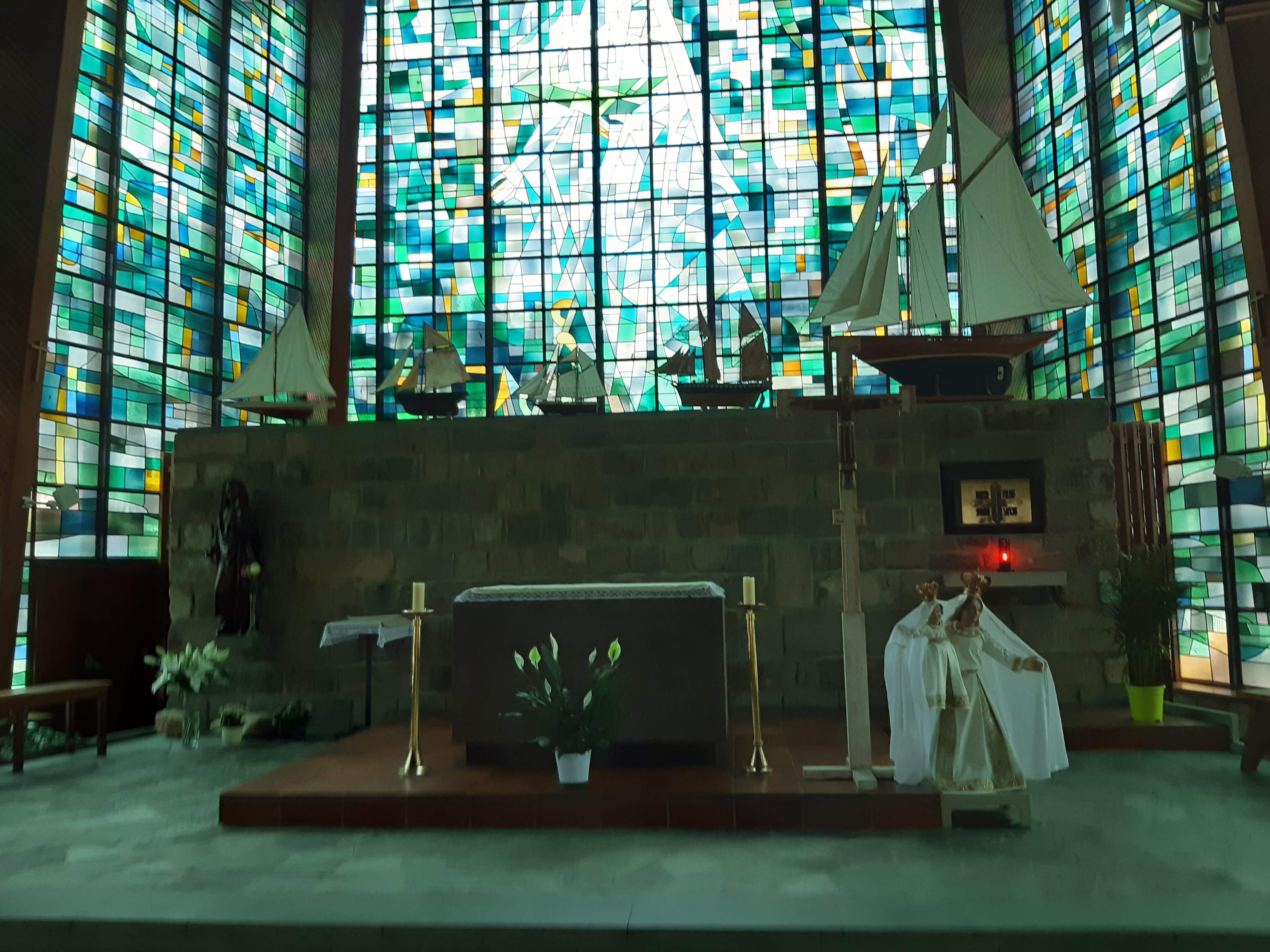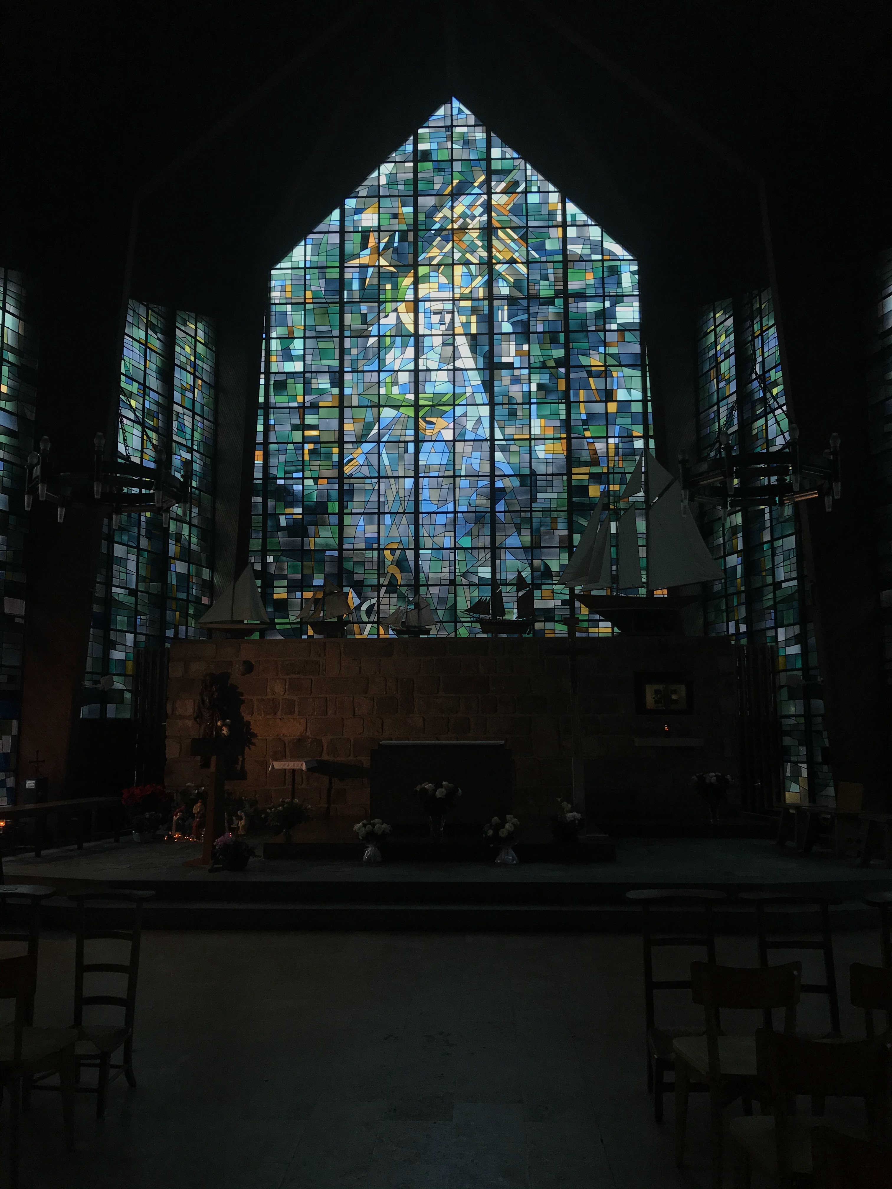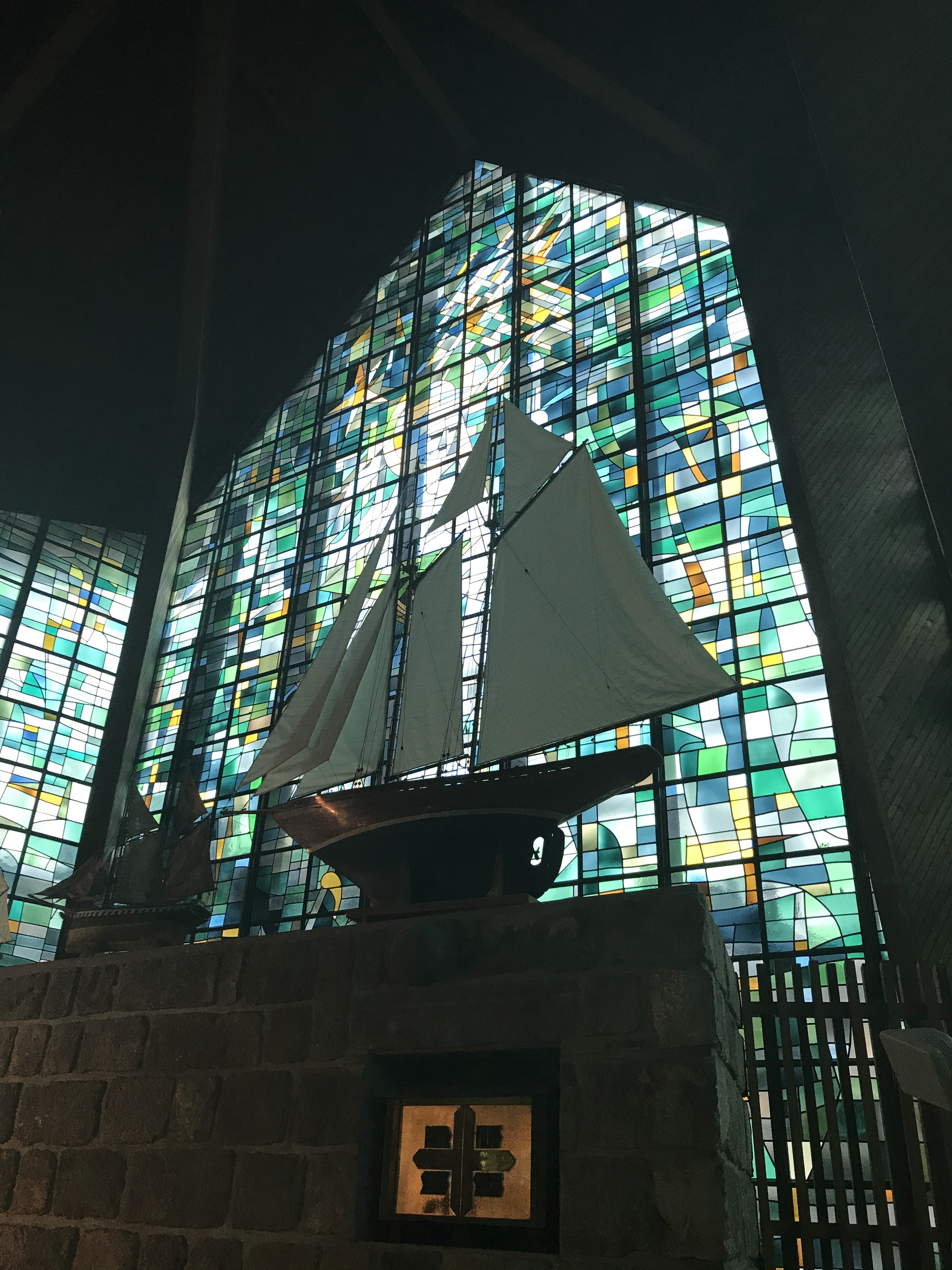 Un bel hommage aux marins. Les vitraux sont impressionnants, j'avais la sensation d'être dans un kaléidoscope quand les rayons du soleil jouaient avec les différents bleus des vitraux. Magnifique.