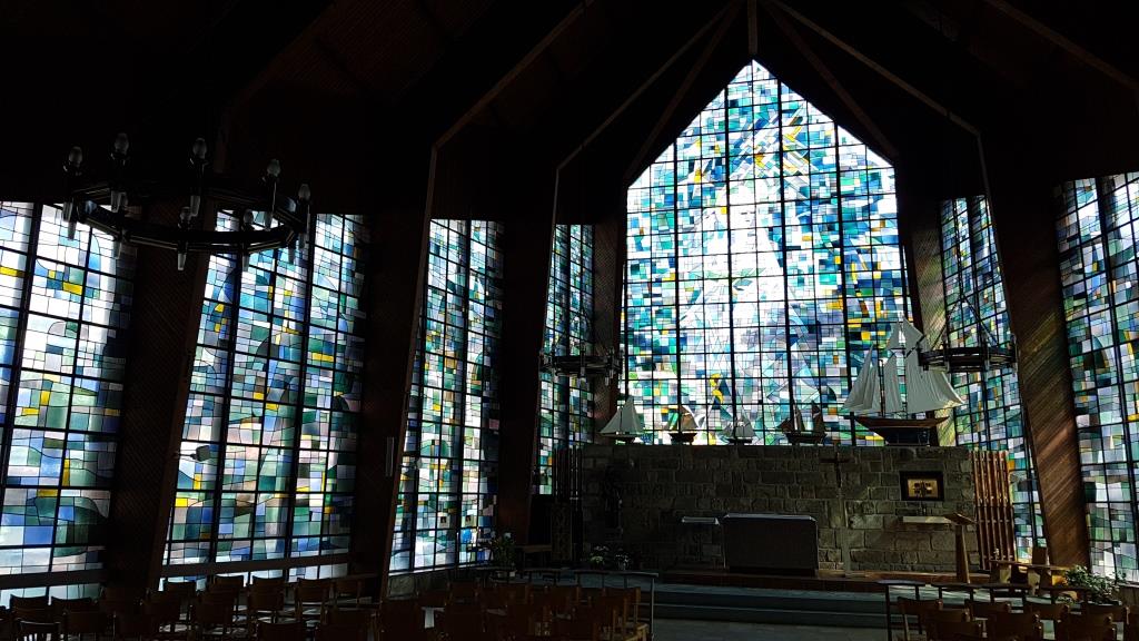 L'intérieur de la chapelle est très beau avec ses vitraux. Le toit est en forme de bateau retourné.