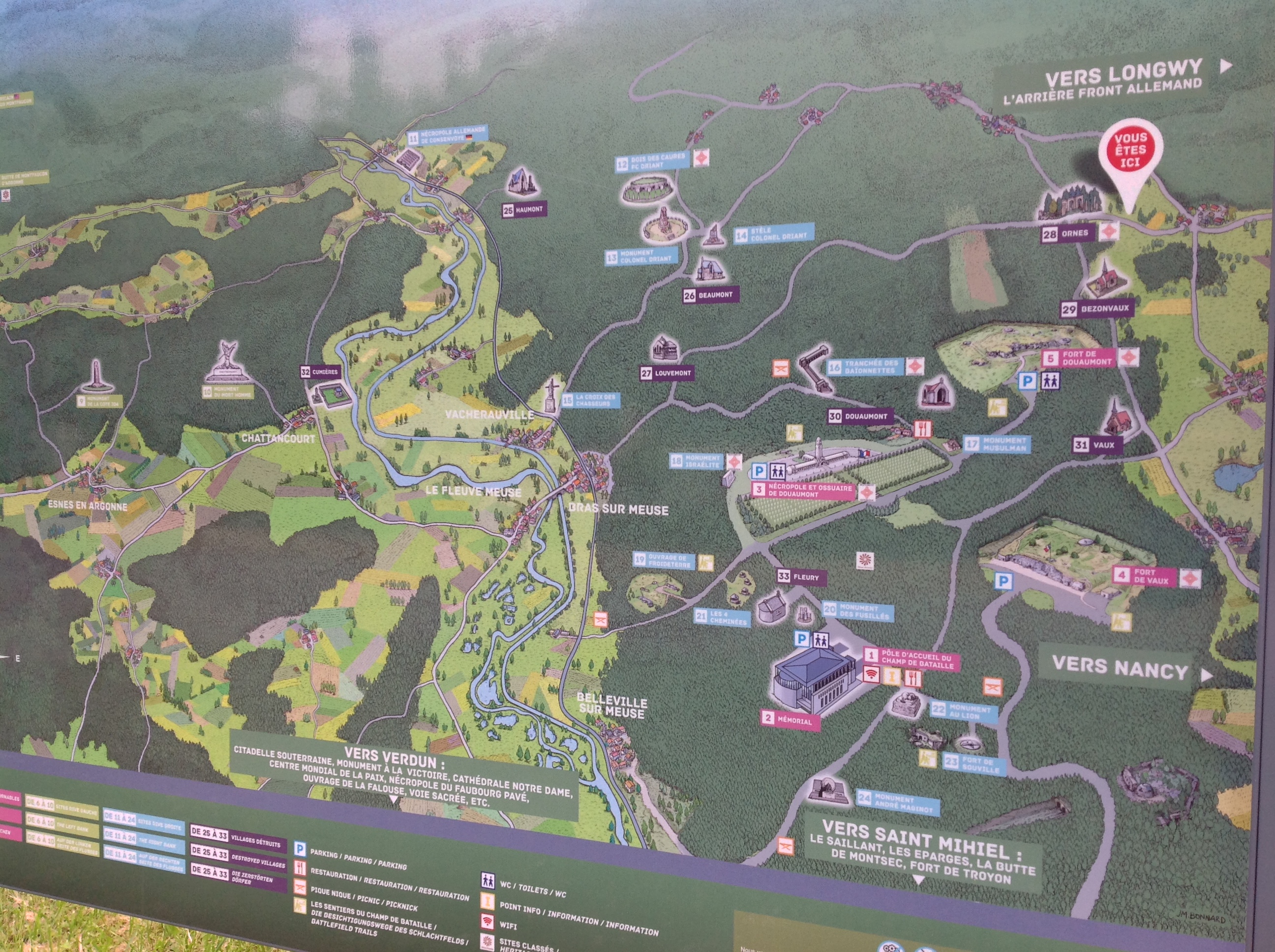 Cet endroit marque une desportes du champ de bataille de Verdun, il y en a d'autres bien sûr en d'autres points cardinaux. Elles ont toutes en commun un village détruit, réduit à néant, un relief meurtri que la végétation après plus d'un siècle maintenant peine encore à masquer. Ici, il y subsiste encore les ruines magnifiques de l'ancienne église dont les colonnes se dressent vers le ciel tel les moailles sur l'île de Pâques. Le silence y règne, quelques tables y sont aménagées pour un picnic occasionnel.