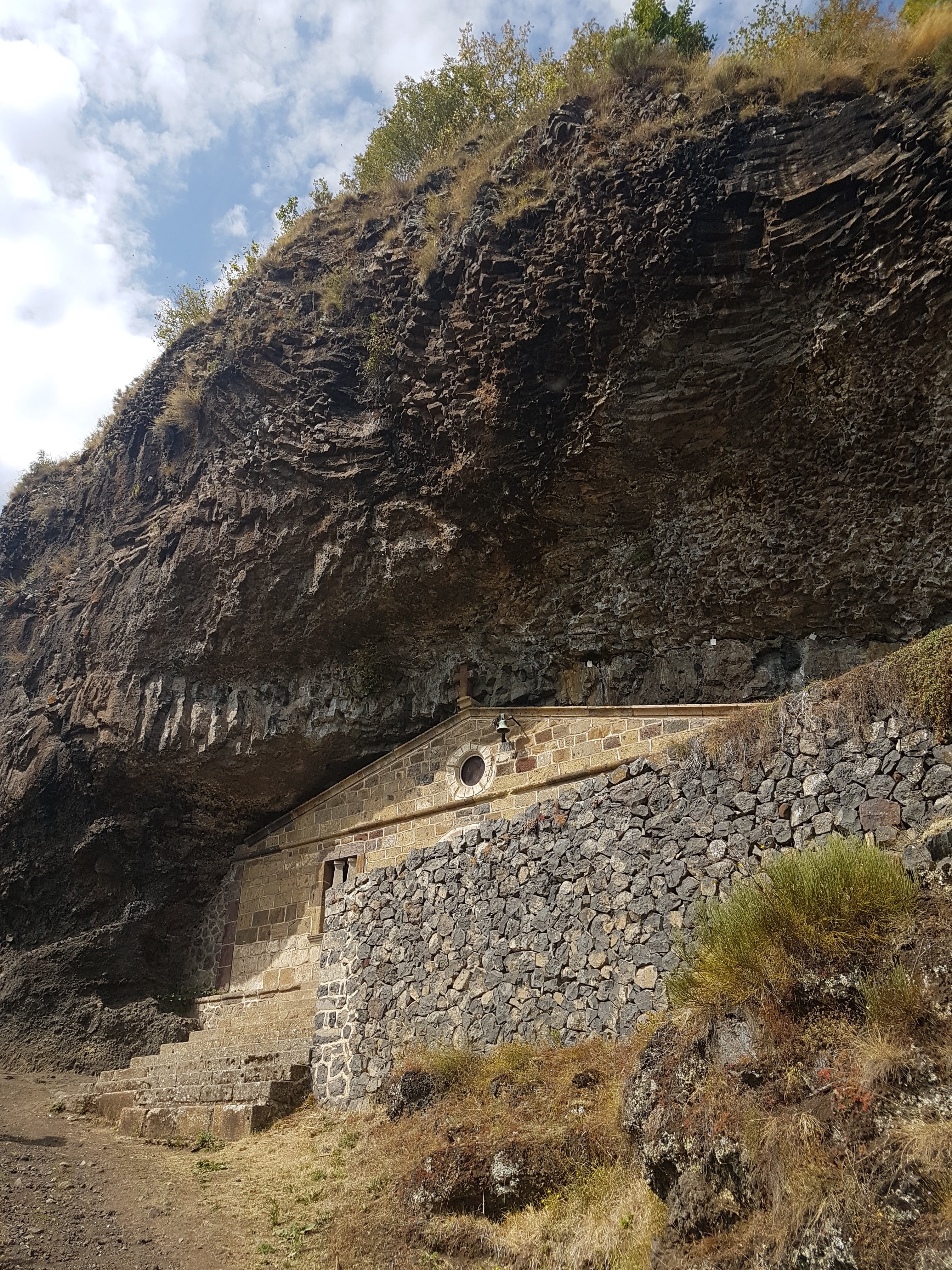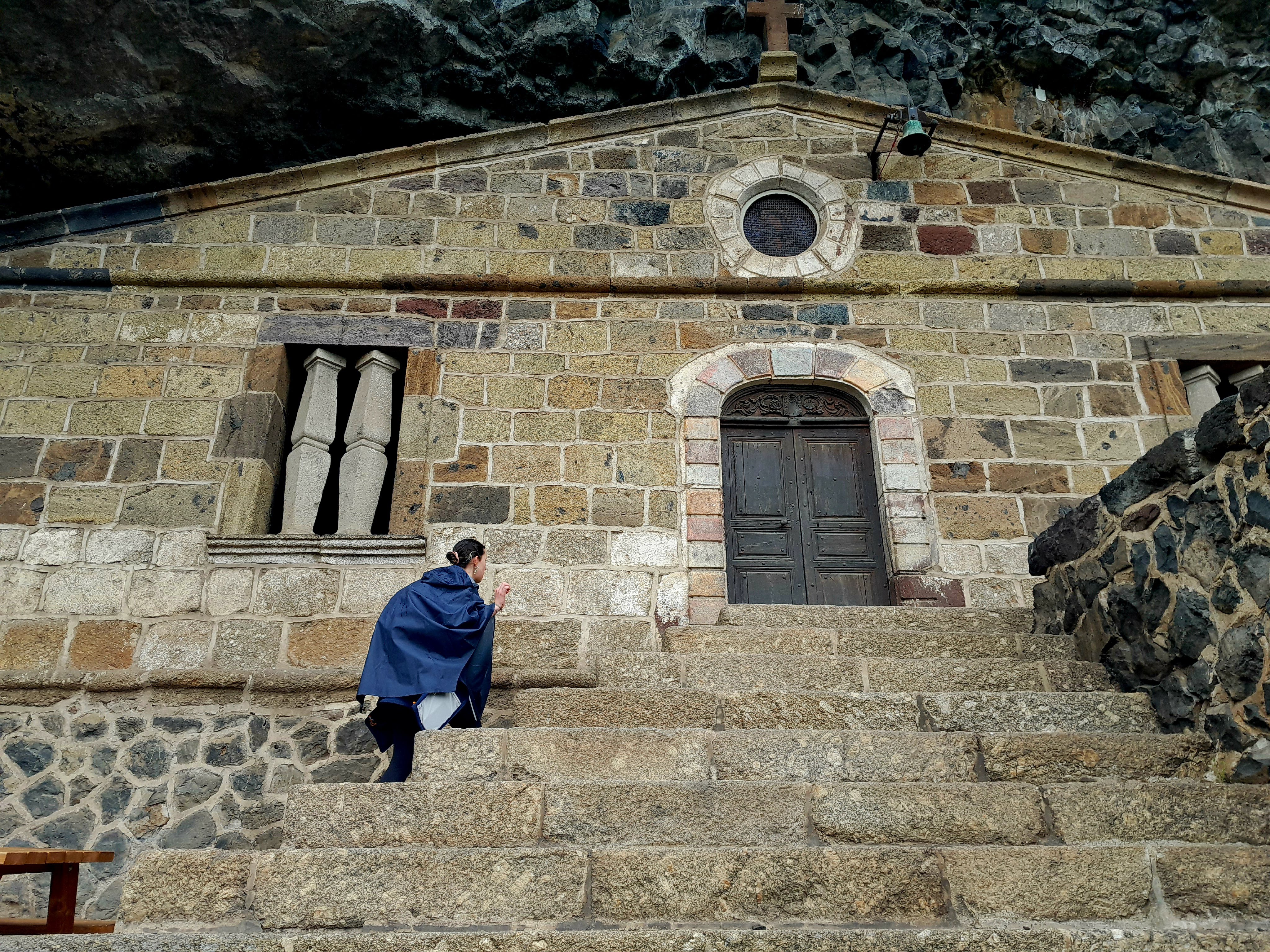 Apparition irréelle sur le chemin de St Jacques de Compostelle, de cette chapelle sous les orgues basaltiques.
