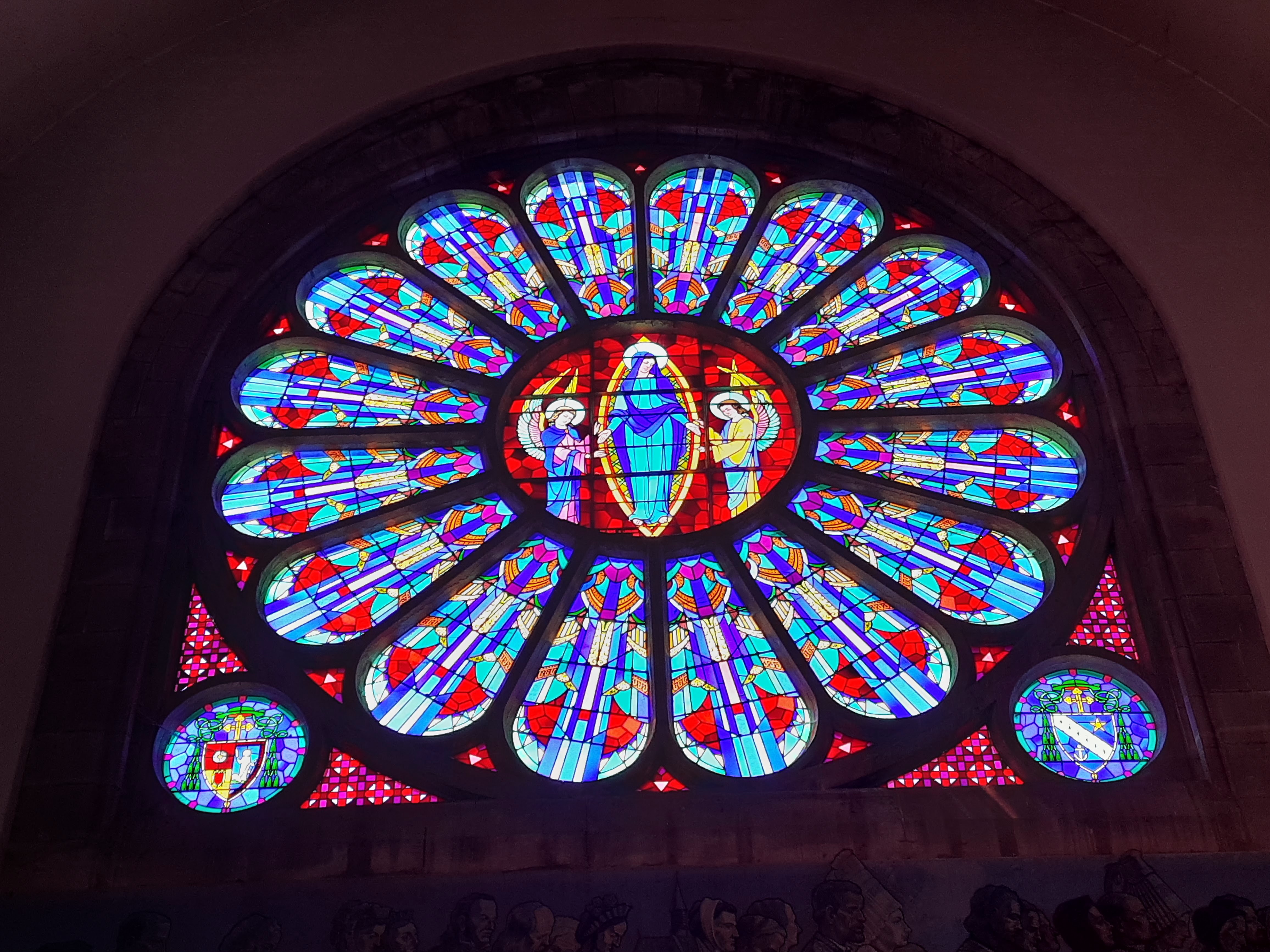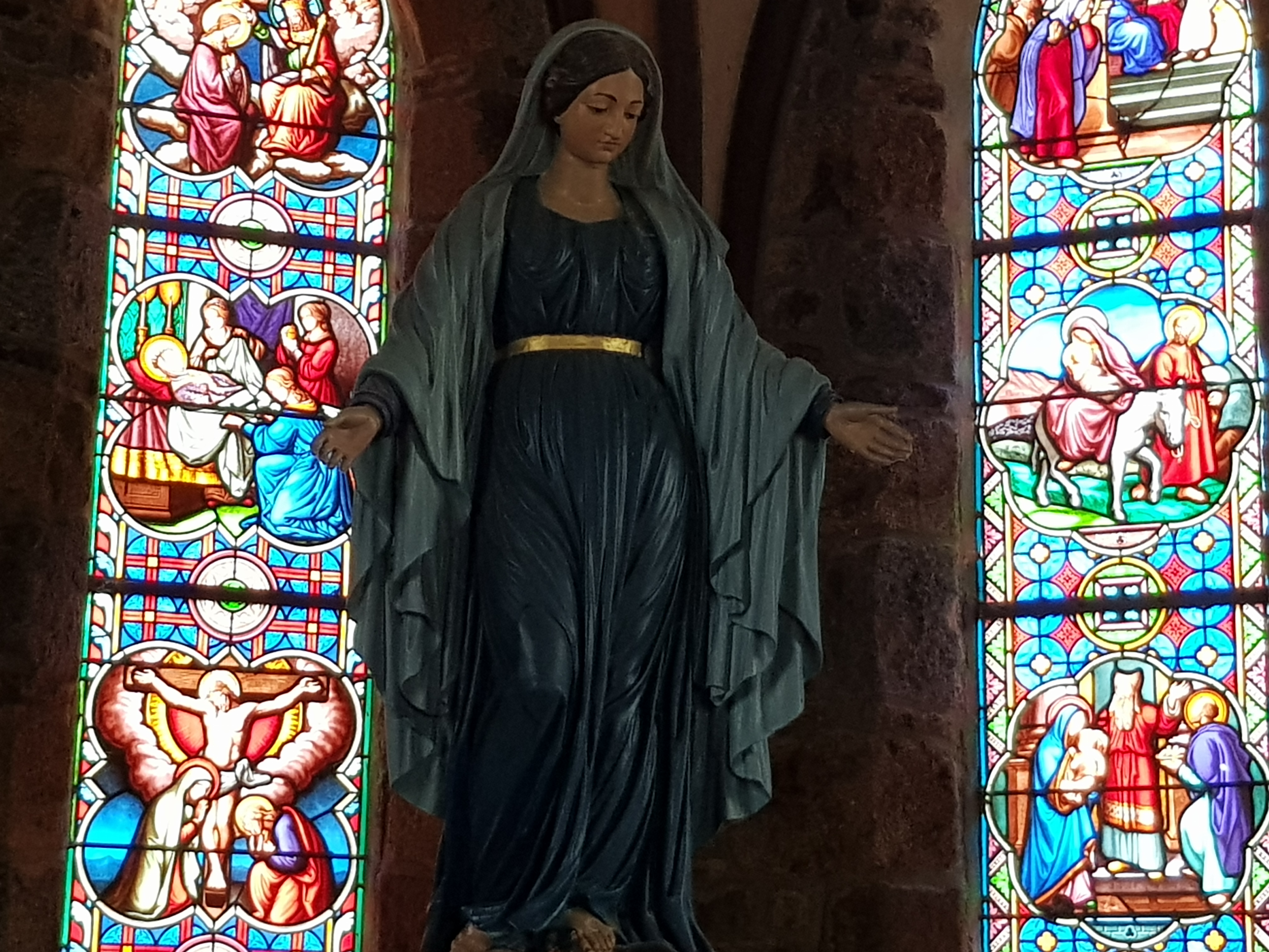Belle église et chapelle. Magnifique vitrail ; couleurs intenses vues de l'intérieur. Grandes peintures murales. Endroit calme.